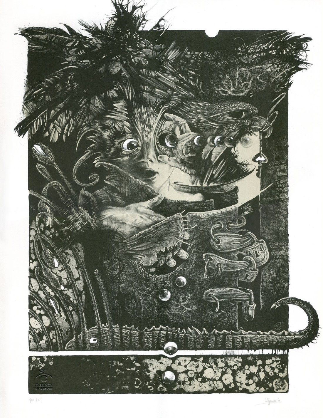 Ulyana’s lithographs are distinguished by the softness and precision of line, subtle tonal gradation, and rich color palette. Their symbolic and highly detailed compositions invite viewers to repeatedly explore hidden meanings and immerse themselves in quiet contemplation.