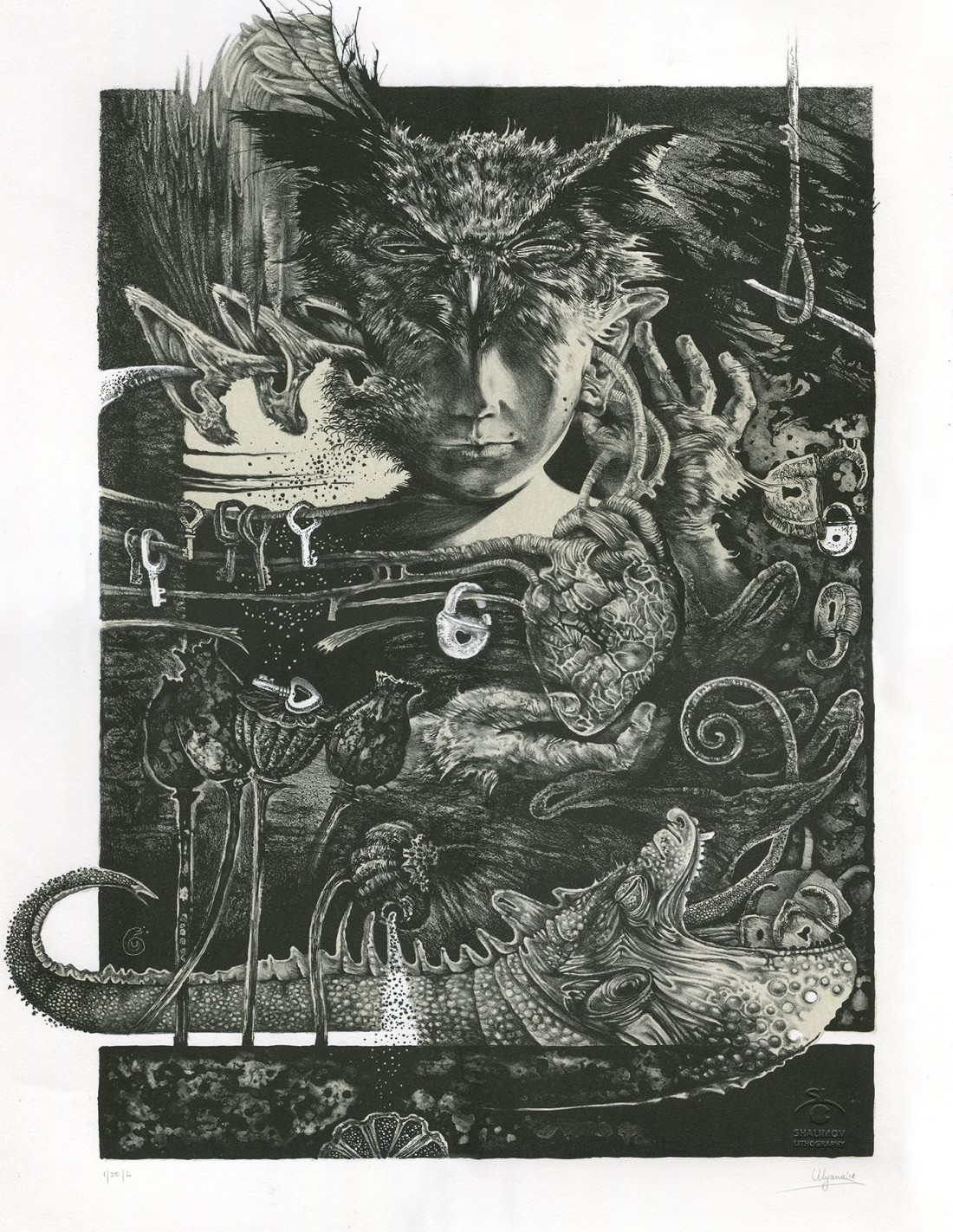 Ulyana’s lithographs are distinguished by the softness and precision of line, subtle tonal gradation, and rich color palette. Their symbolic and highly detailed compositions invite viewers to repeatedly explore hidden meanings and immerse themselves in quiet contemplation.