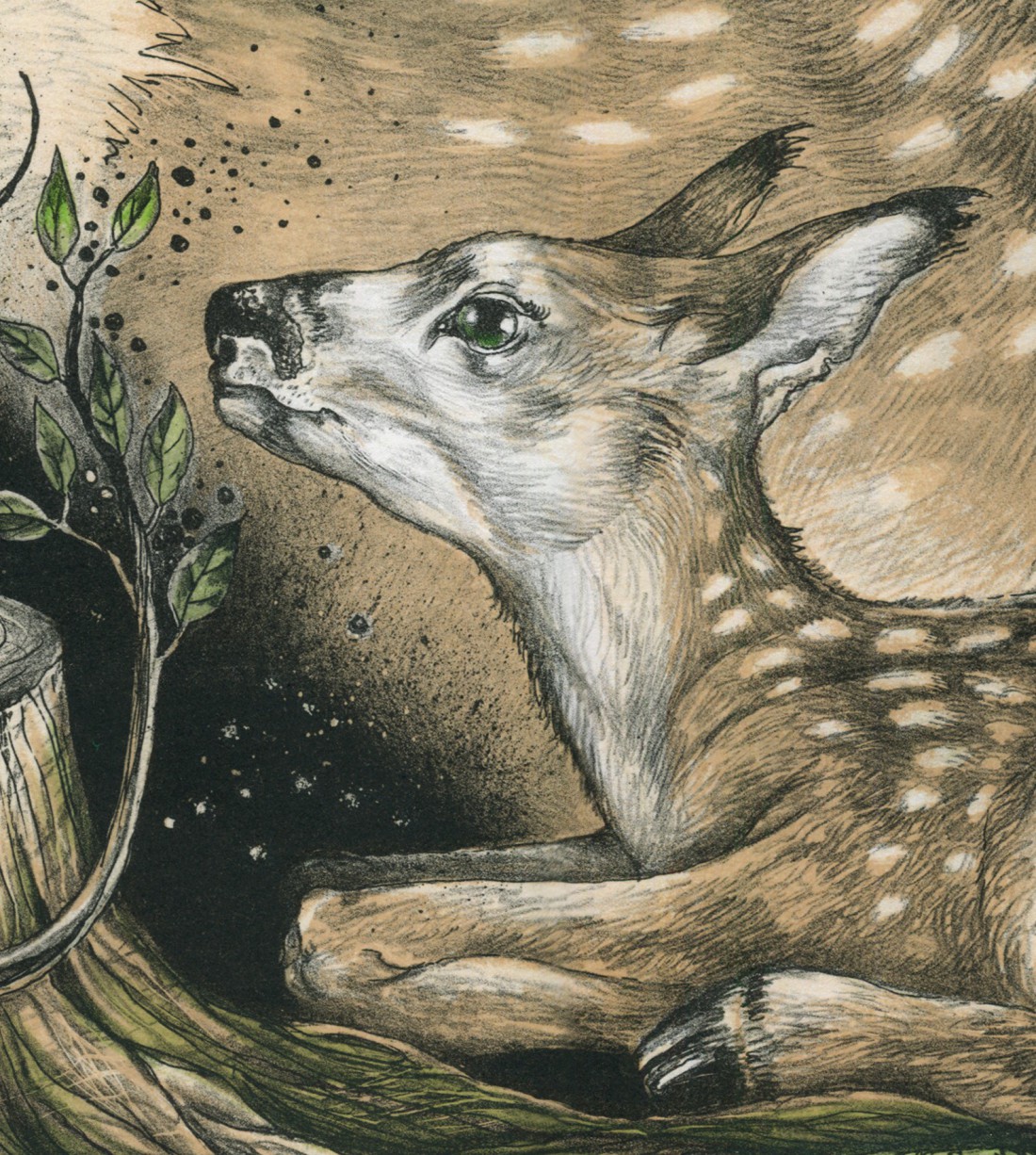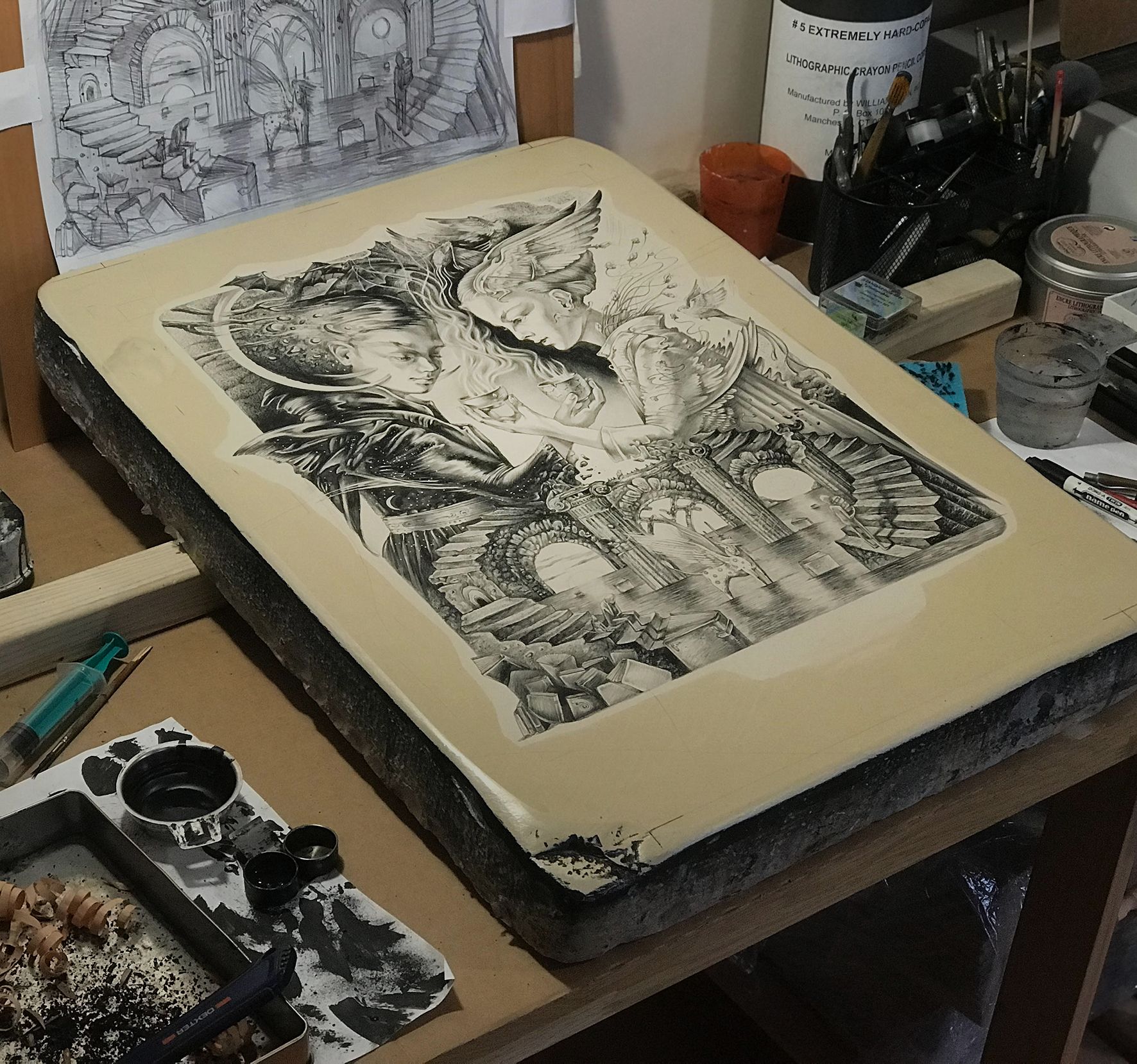 The drawing is made directly on the stone using a special lithographic pencil and ink, employing a variety of techniques.